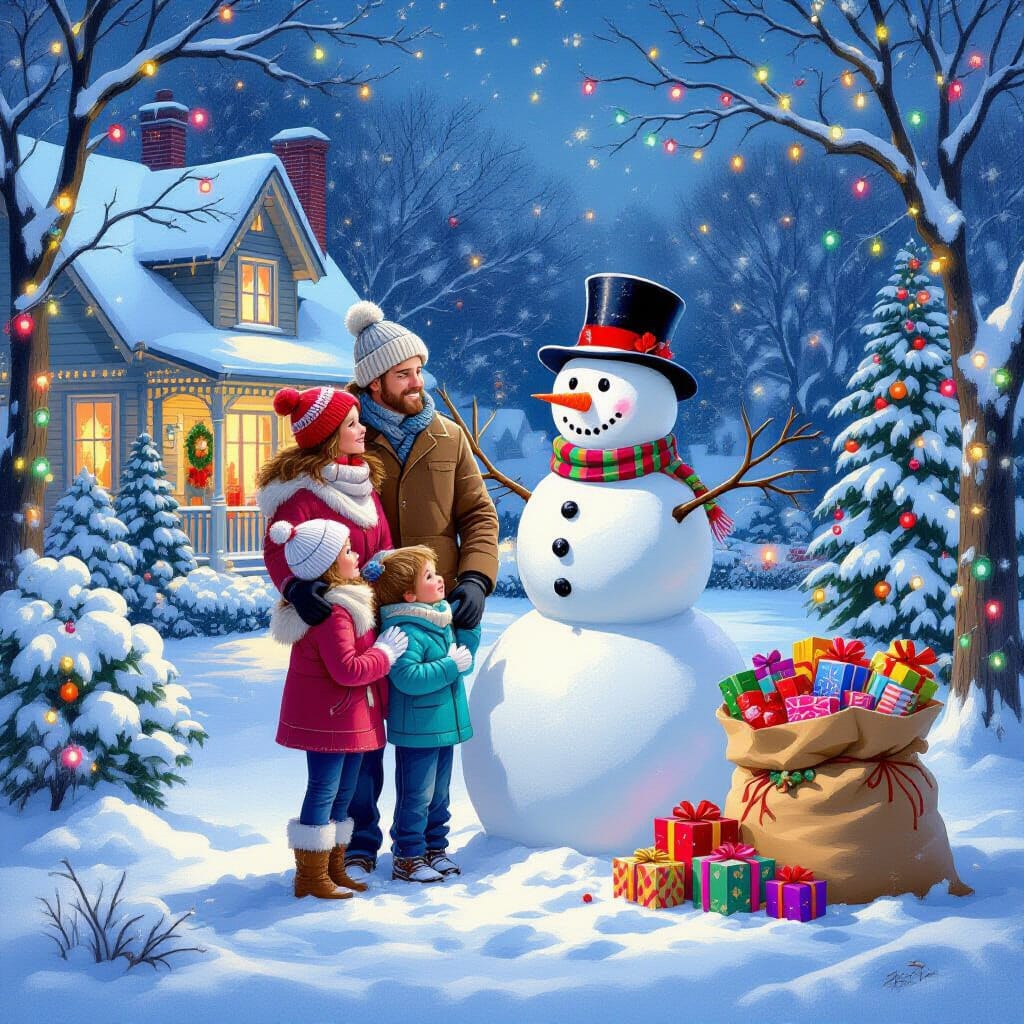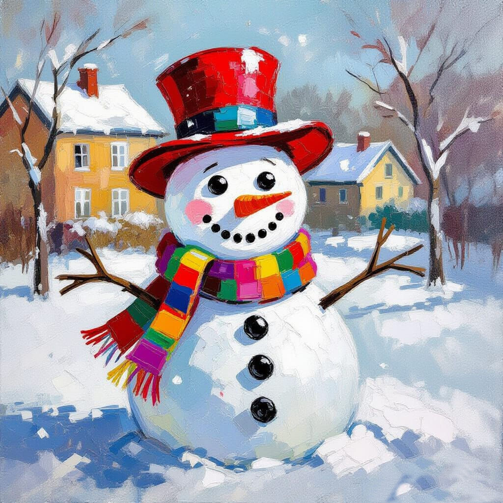 Peinture à l’huile expressionniste représentant un bonhomme de neige joyeux dans une cour d’école. Le bonhomme de neige est orné d’un chapeau rouge, d’un nez en carotte, d’yeux noirs en bouton et d’une grande bouche souriante. Il porte une écharpe colorée autour du cou. La scène est rendue avec des coups de pinceau épais et visibles et des couleurs vives et émouvantes, capturant l’esprit ludique de l’hiver. Inspiré par les textures audacieuses d’empâte et l’intensité émotionnelle d’Edvard Munch et Emil Nolde. Des détails subtils comme des flocons de neige épars et une pointe de givre au sol ajoutent de la profondeur à cette composition vivante.