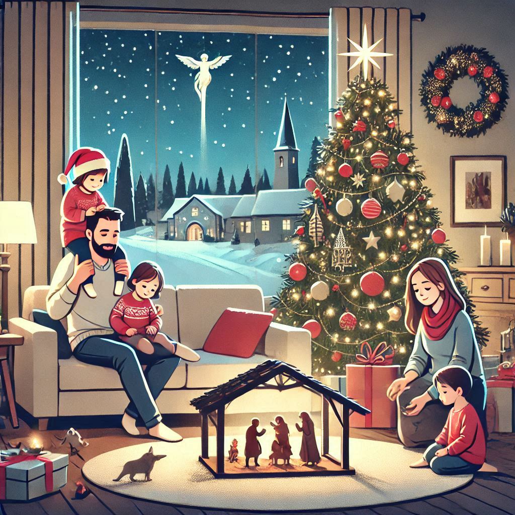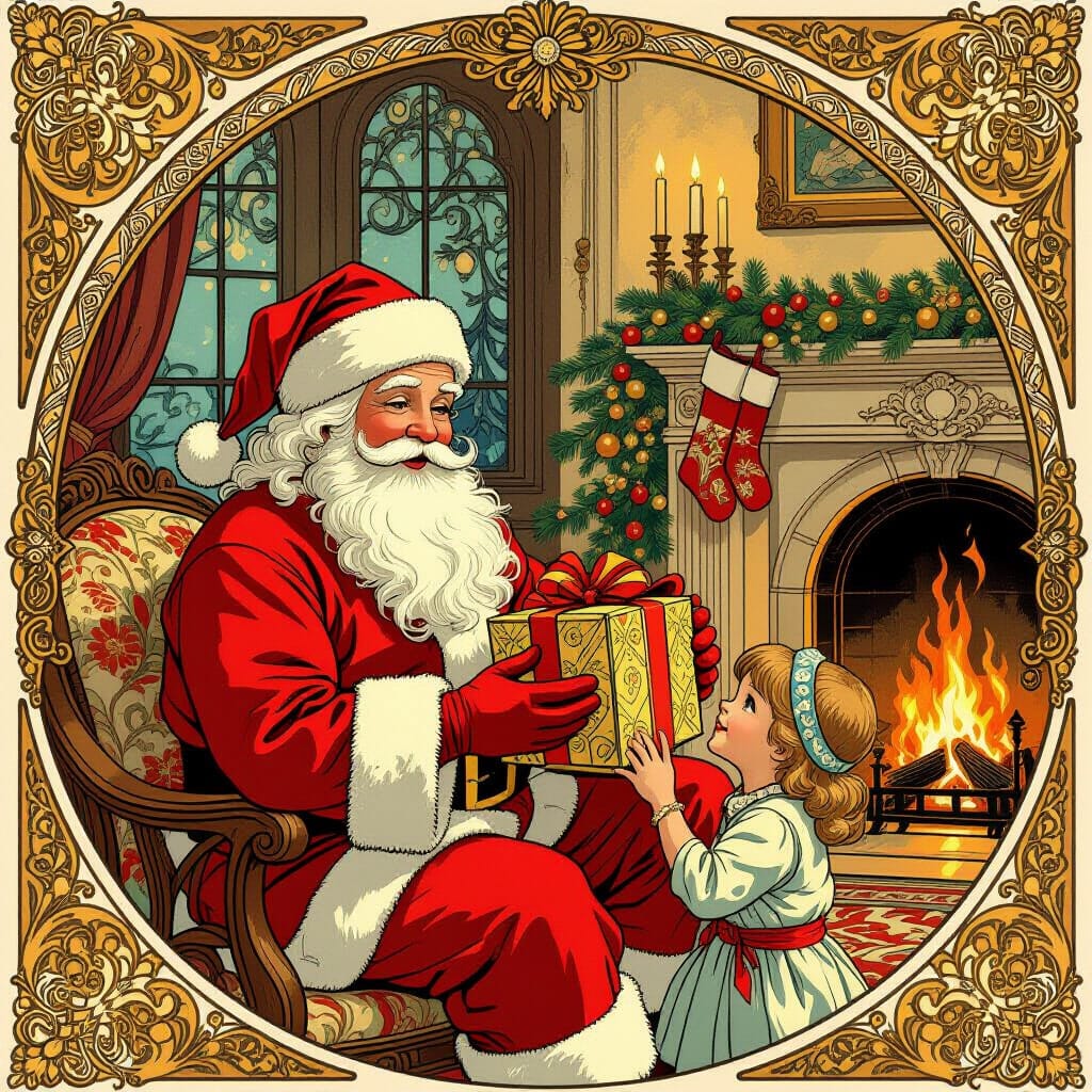 Illustration Art nouveau du Père Noël apportant des cadeaux aux enfants dans un salon douillet, plan moyen. Des lignes fluides complexes dans les vêtements et les décorations. Un design de personnage fantaisiste et chaleureux. Des accents dorés sur les cadeaux et la cheminée. Lumière chaude, vive, festive. Inspiré par Alphonse Mucha, avec ses lignes fluides caractéristiques et son élégance décorative, ainsi que par le style charmant et illustratif d’Arthur Rackham.