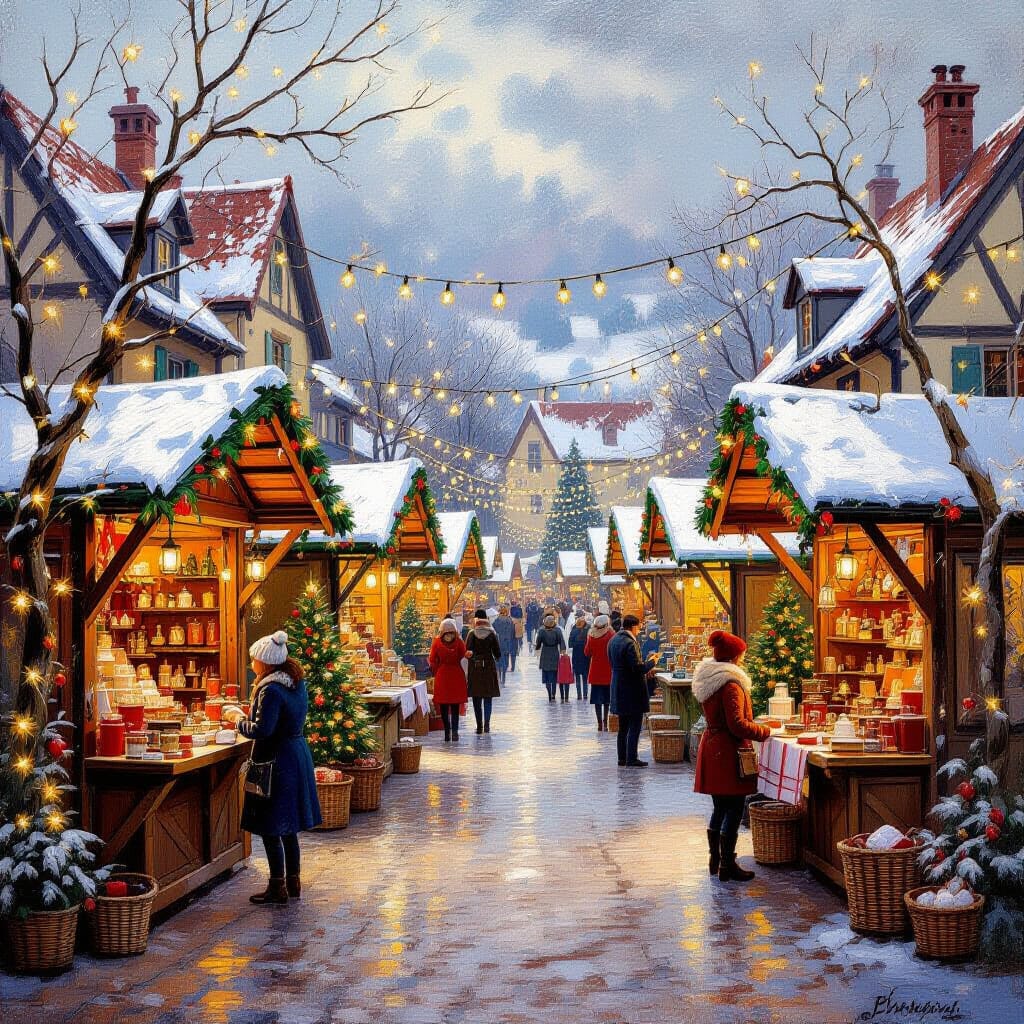 Un marché de Noël animé ouvre ses portes dans un pittoresque domaine viticolique, rempli de nombreux artisans exposant leurs œuvres artisanales. Des guirlandes lumineuses scintillantes illuminent de charmants étals en bois chargés de produits faits main, tandis que l’odeur du vin chaud et du pain d’épices emplit l’air vif de l’hiver. La scène est réalisée dans un style de peinture à l’huile chaleureux et accueillant, avec une touche d’impressionnisme, évoquant l’esprit festif et le charme artisanal. Inspiré par les œuvres de Pierre-Auguste Renoir et Camille Pissarro, avec un accent sur des textures riches, des couleurs vibrantes et un éclairage tacheté filtrant à travers les vignes nues.