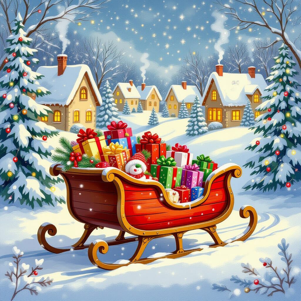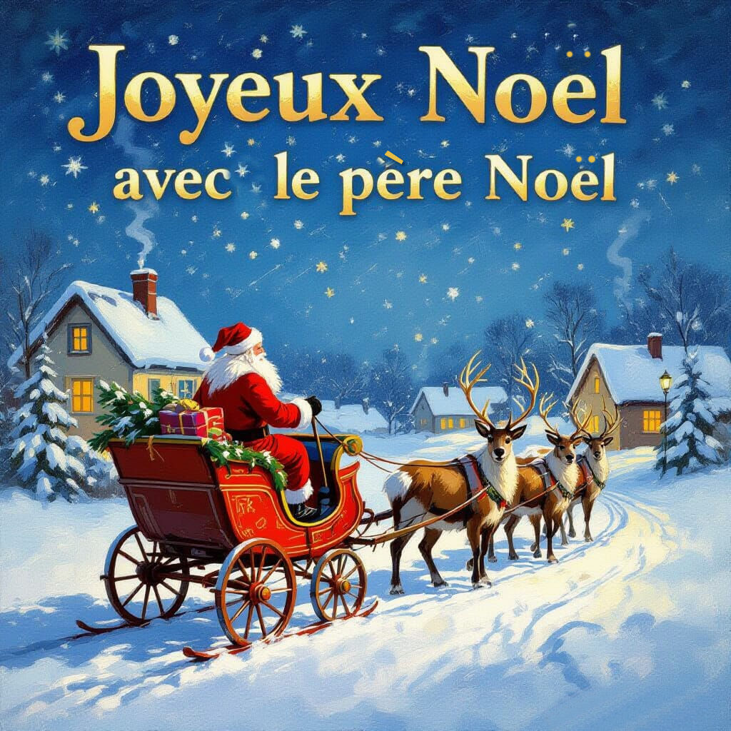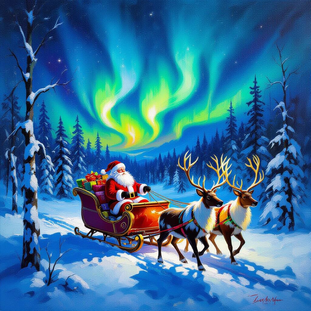 Peinture à l’huile expressionniste représentant le Père Noël traversant une forêt enneigée la nuit, avec un ciel rempli de lumières boréales tourbillonnantes. Son traîneau débordait de cadeaux, tiré par des rennes aux harnais lumineux. La scène est rendue avec des coups de pinceau épais et une palette de couleurs vibrantes et émotives, inspirée par l’expressivité intense d’Edvard Munch et l’utilisation audacieuse des couleurs de Wassily Kandinsky. La lumière et l’ombre dynamiques créent une atmosphère festive mais sauvage, avec un accent mis sur les éléments lumineux de la scène.