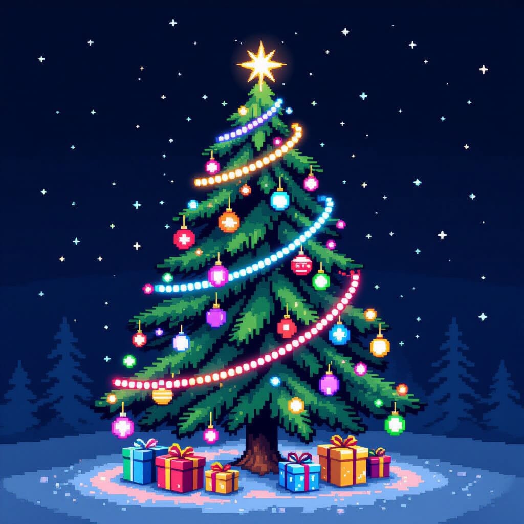 Sapin de Noël pixel art décoré de décorations rétro éblouissantes et lumineuses et colorées. L’arbre se dresse sur un fond simple et sombre, mettant en valeur les ornements anguleux et lumineux. Inspiré par l’esthétique des premiers jeux vidéo, rendu avec un style 8 bits distinctif, lumineux, rappelant les jeux d’arcade classiques, avec des lignes numériques nettes et une palette de couleurs vive et saturée.